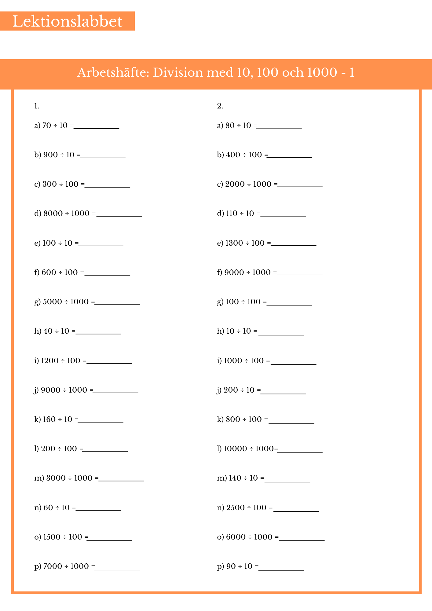 Öva på kort division med 100 och 1000 - tal. Tal där det går jämnt ut i slutet.