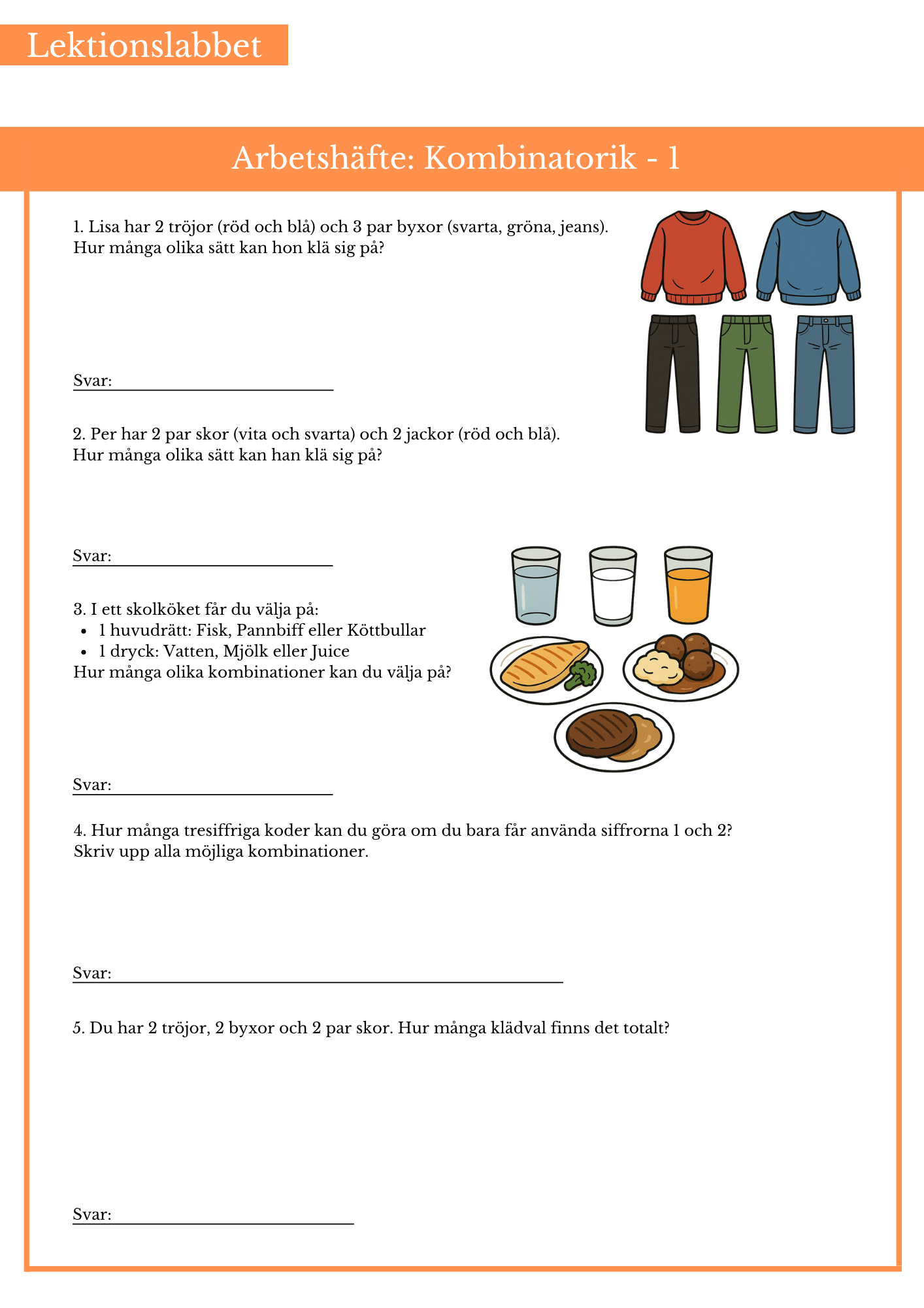 Öva på kombinatorik. Passar bäst till årskurs 6. Sida 2 och 3 är på en avancerad nivå.