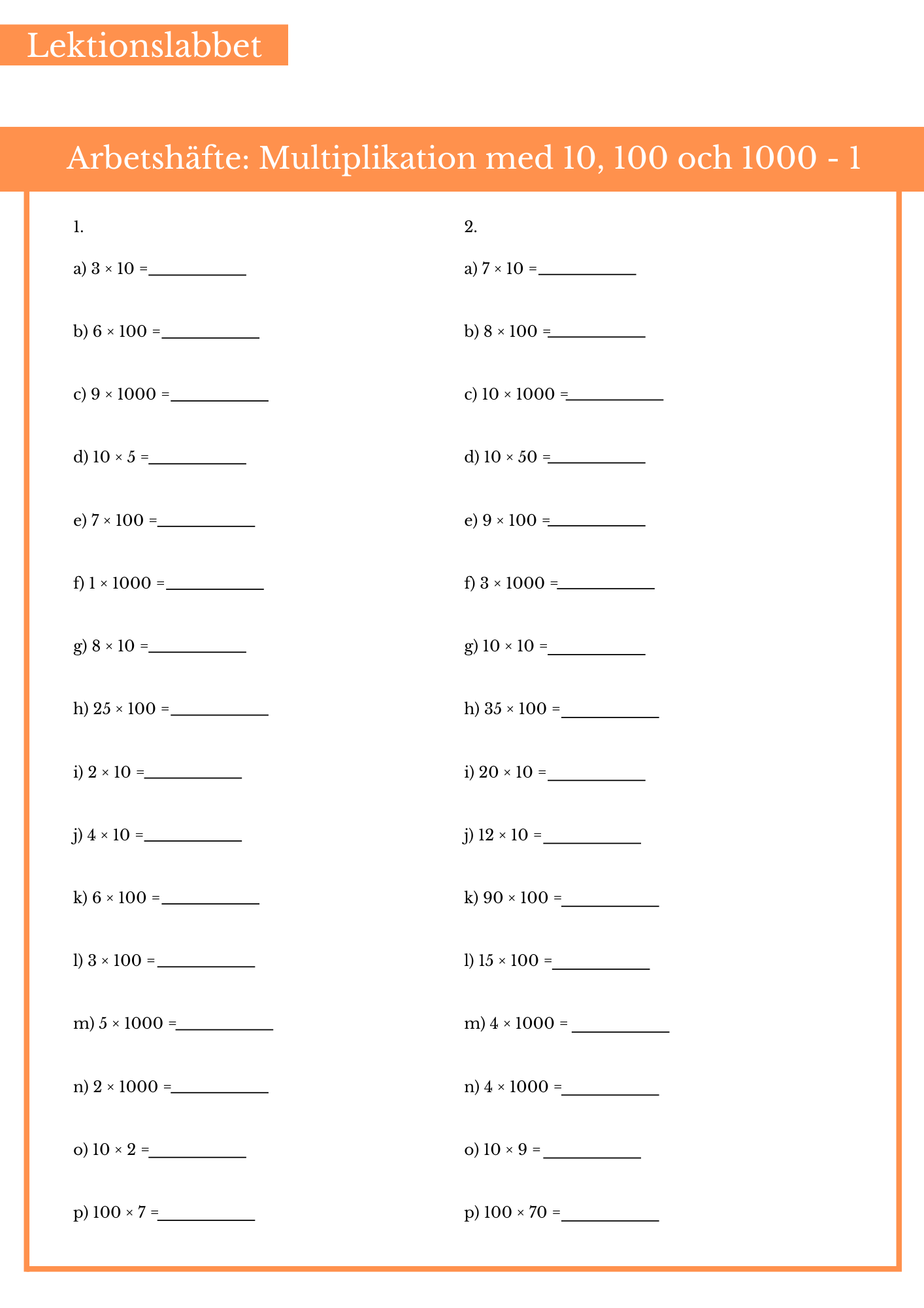 Öva på multiplikation med 1000, 100 och 10 både med heltal och decimaltal. Passar bäst årskurs 4, 5 och 6.