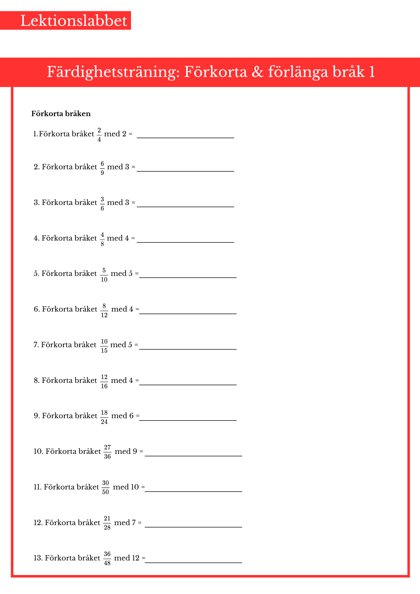 Öva på att förkorta och förlänga bråk. Passar bäst årskurs 5 och 6.
