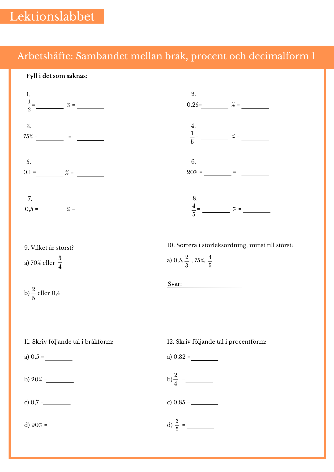 Öva på begrepp inom bråk, procent och decimaltal som tas upp under mellanstadiet. Passar bäst till årskurs 4, 5 och 6.