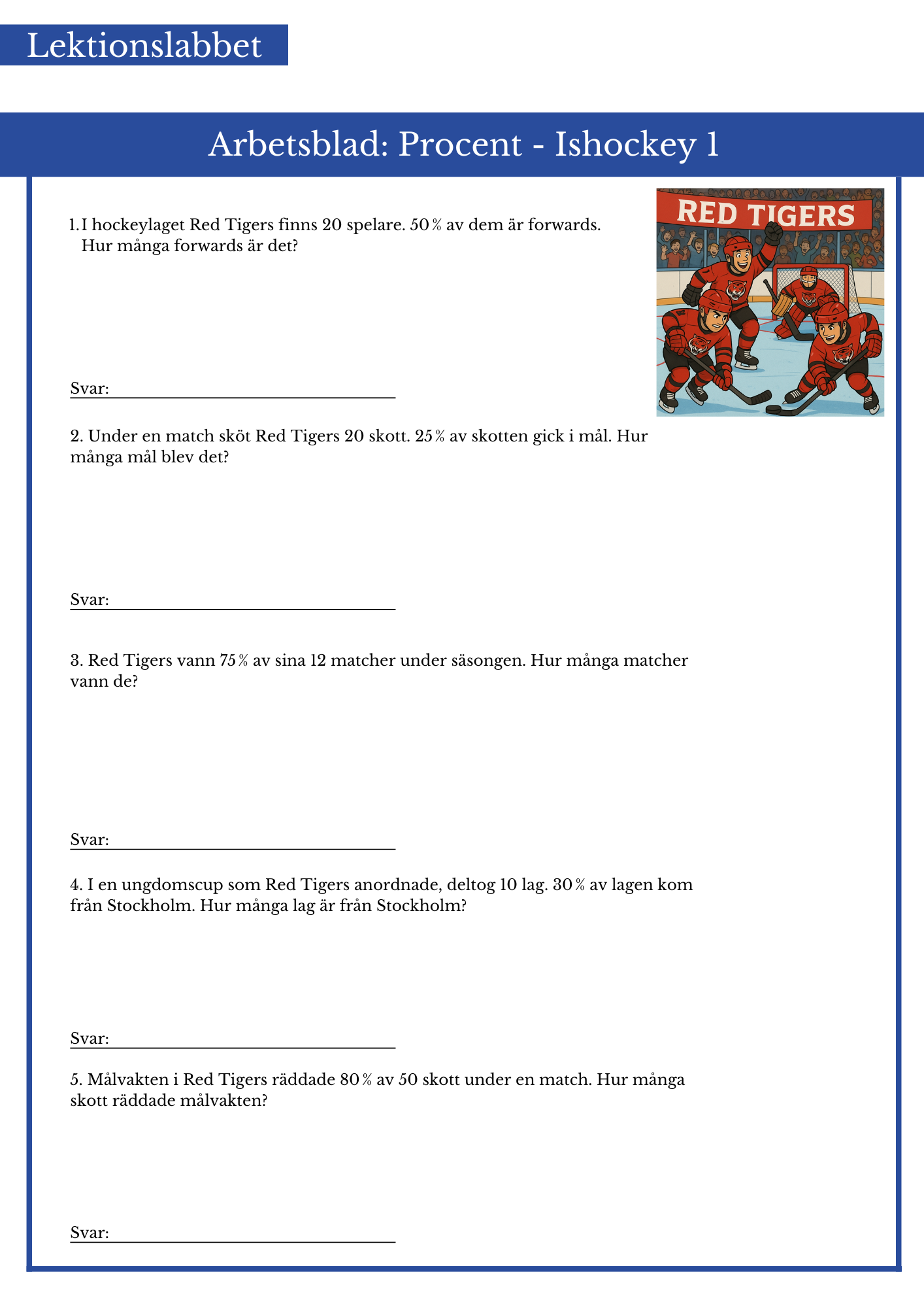 Räkna enbart procent med ishockeytema. Passar bäst årskurs 5 och 6.