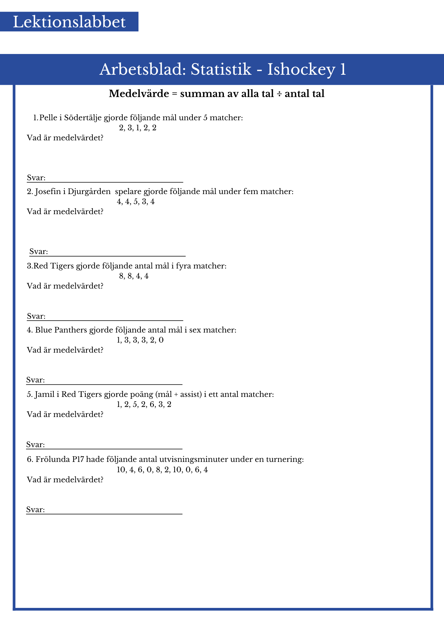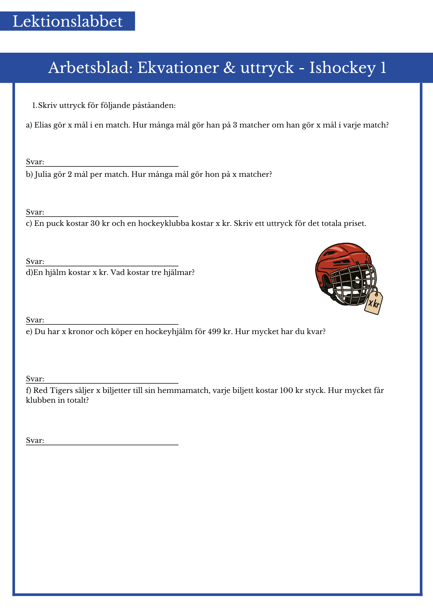 Räkna ekvationer och uttryck med ishockeytema. Passar bäst årskurs 5 och 6.