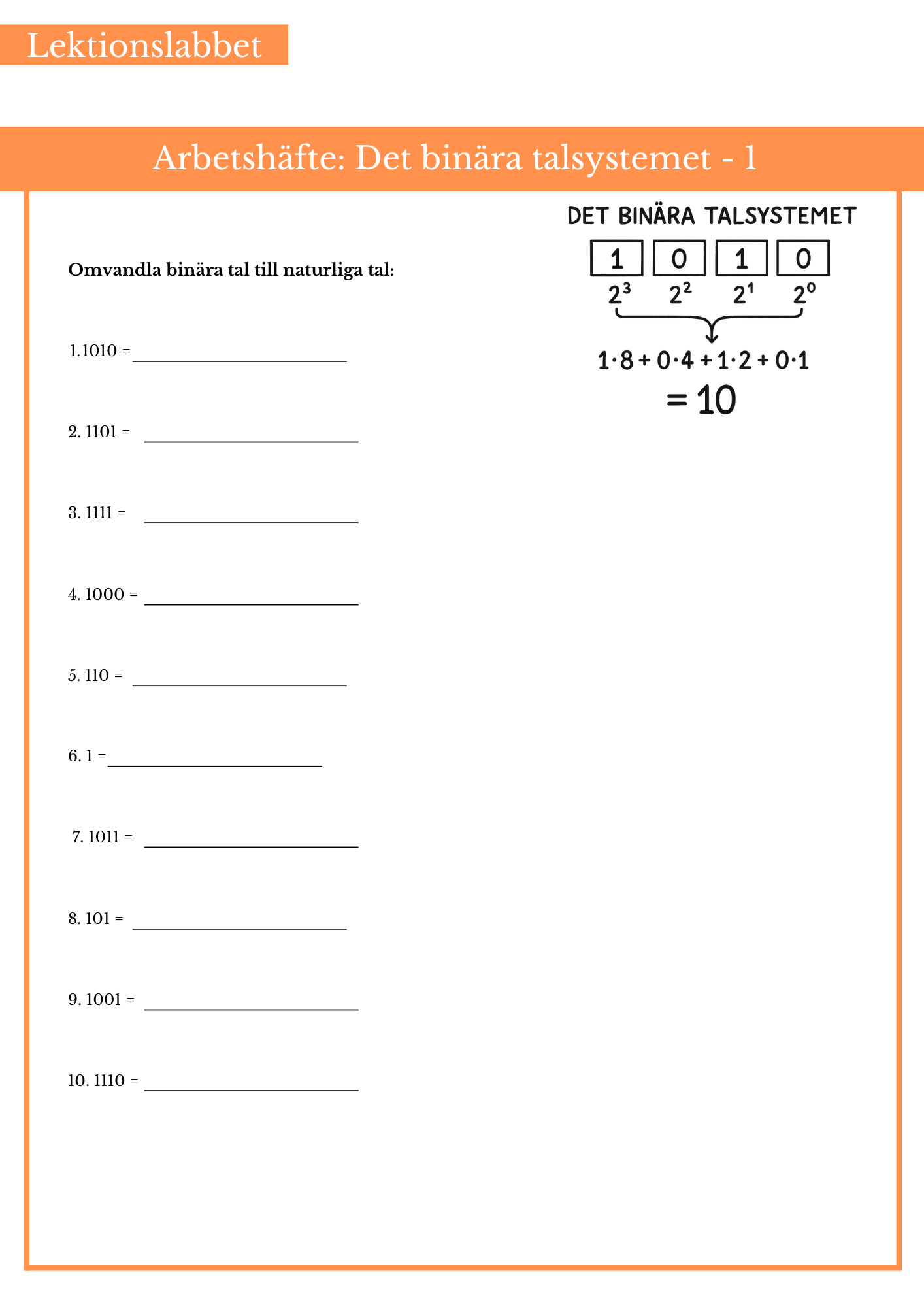 Öva på det binära talsystemet. Passar bäst årskurs 6.