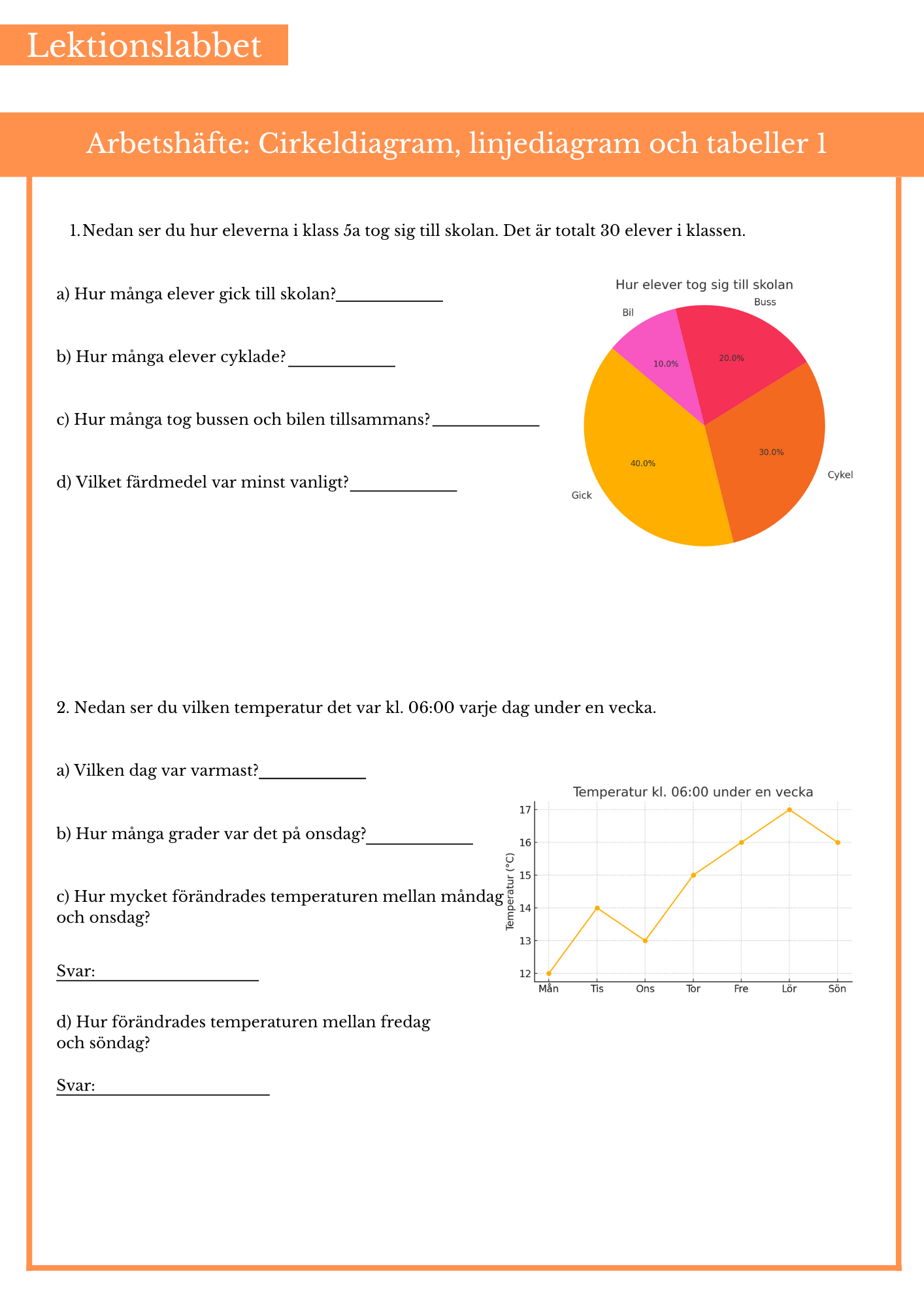 Öva på cirkeldiagram, linjediagram, stapeldiagram och frekvenstabeller. Passar bäst årskurs 4 och 5.