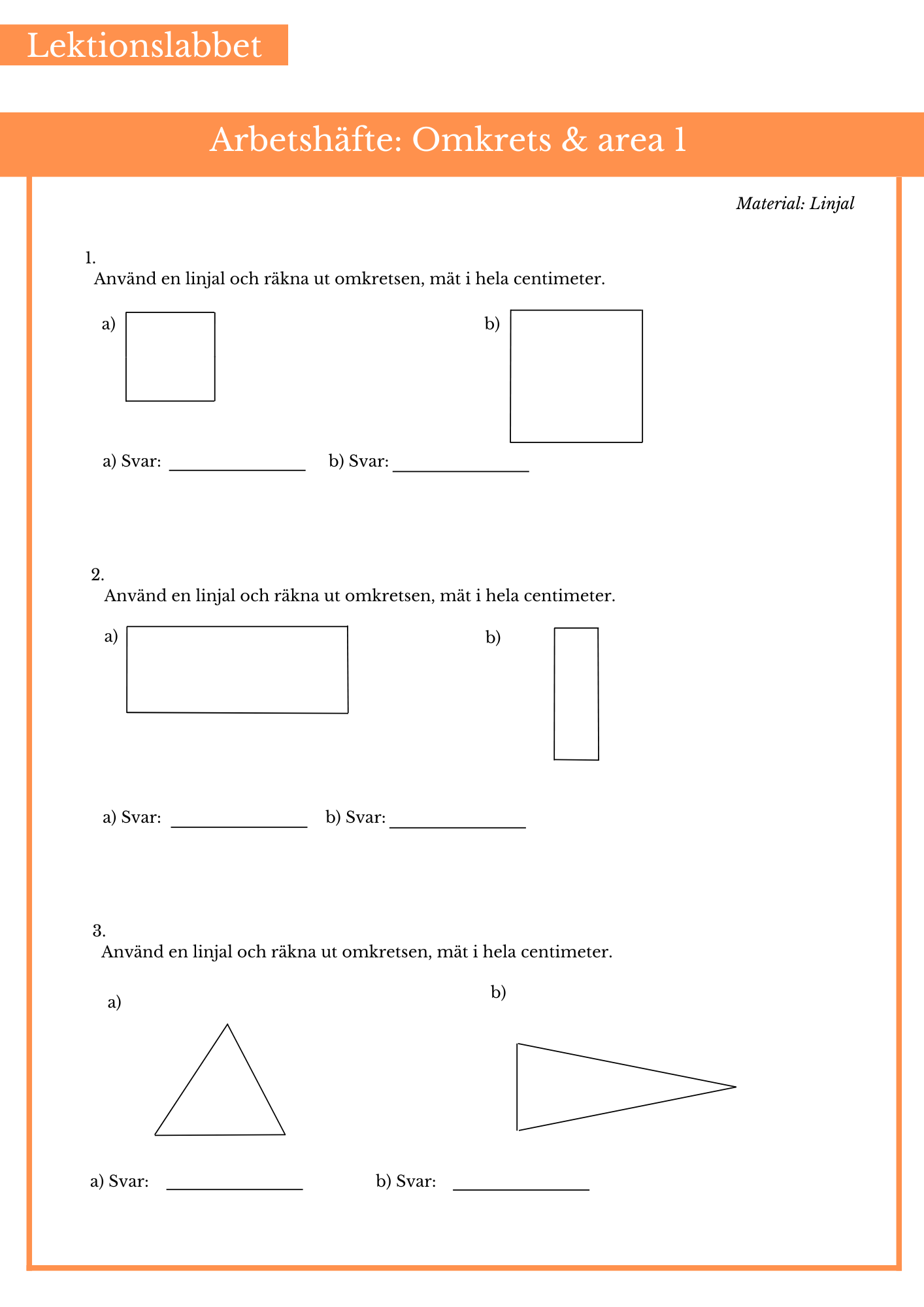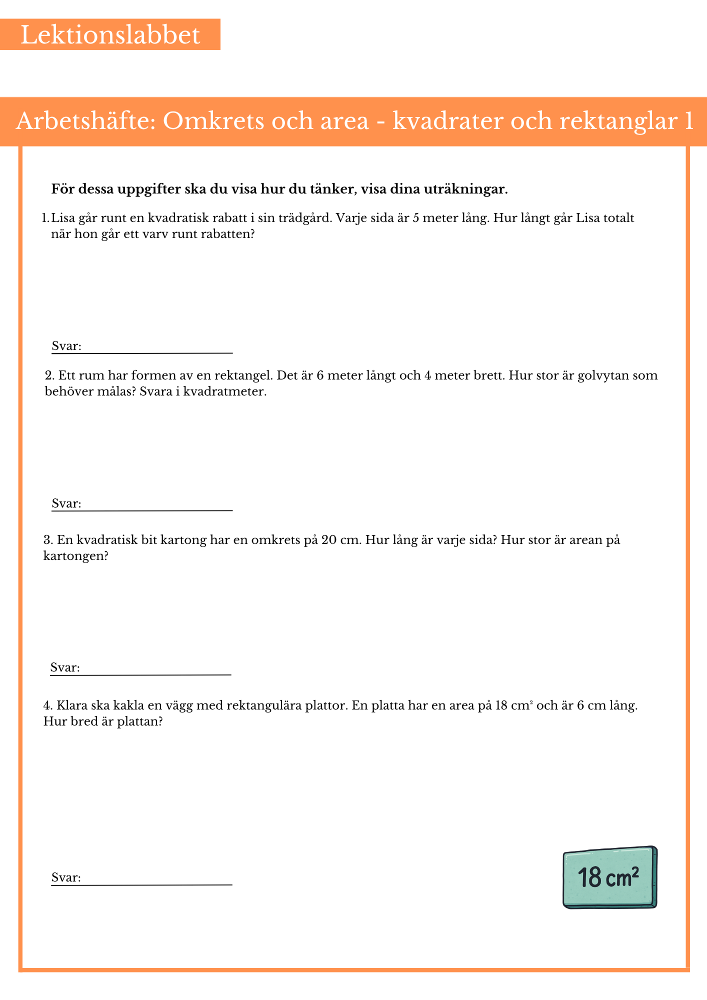 Öva på att räkna ut omkrets och area på kvadrater och rektanglar. Passar bäst till årskurs 4 och 5.