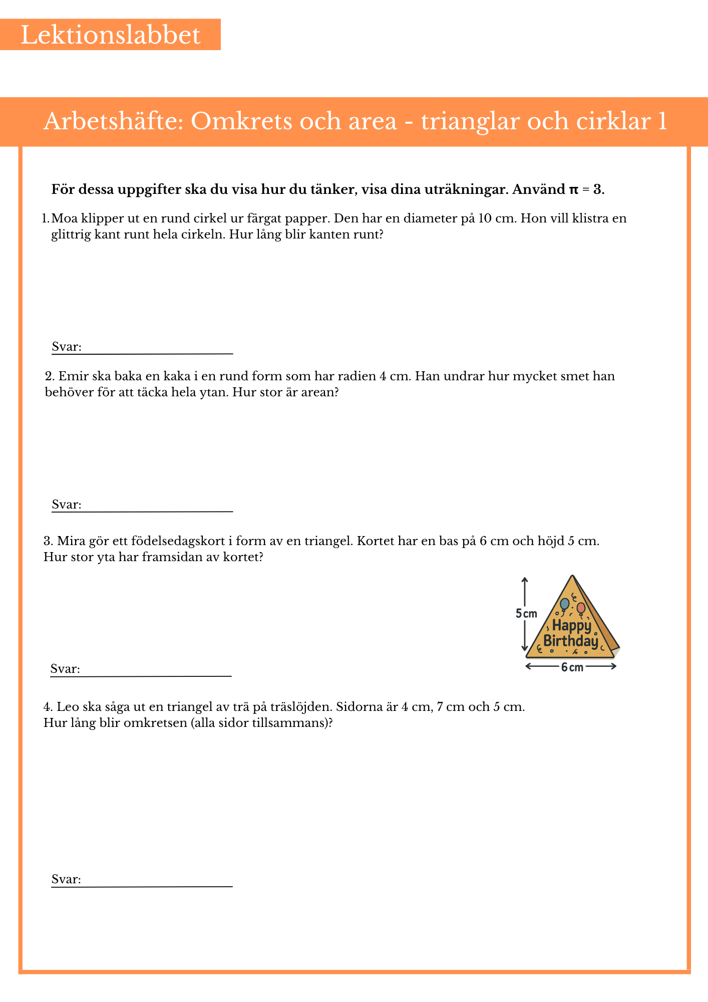 Öva på att räkna ut omkrets och area på cirklar och trianglar. Passar bäst till årskurs 5 och 6.