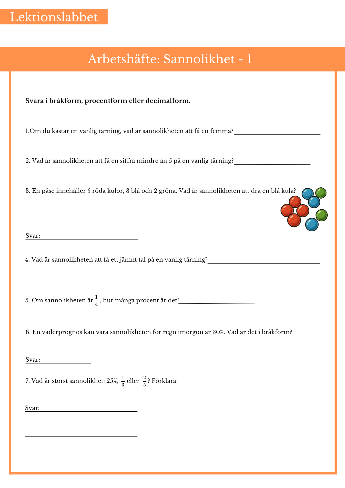 Öva på sannolikhet. Passar bäst årskurs 6.