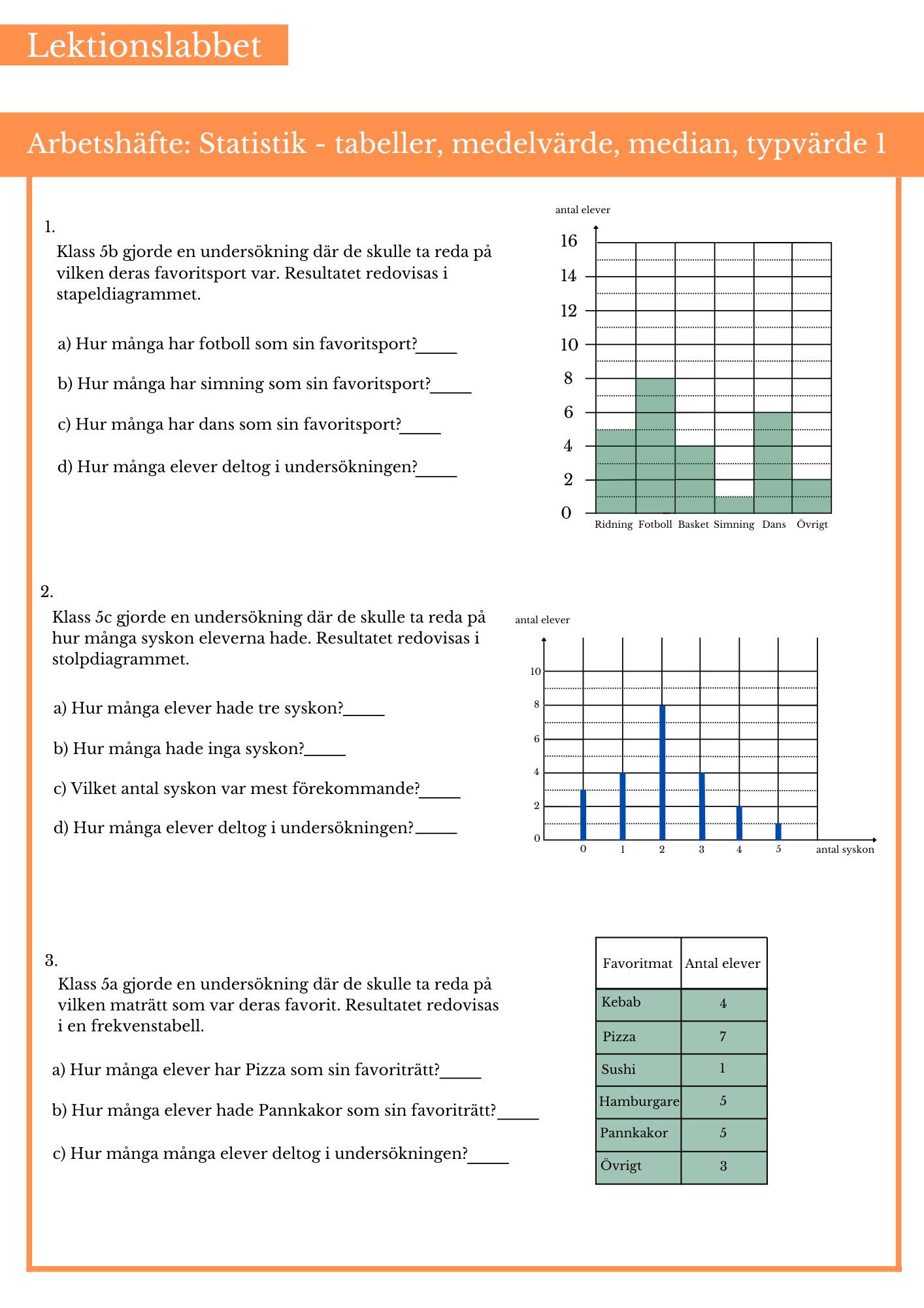 Öva på stapeldiagram, stolpdiagram, frekvenstabell, cirkeldiagram, medelvärde, median och typvärde. Passar bäst årskurs 5 och 6.