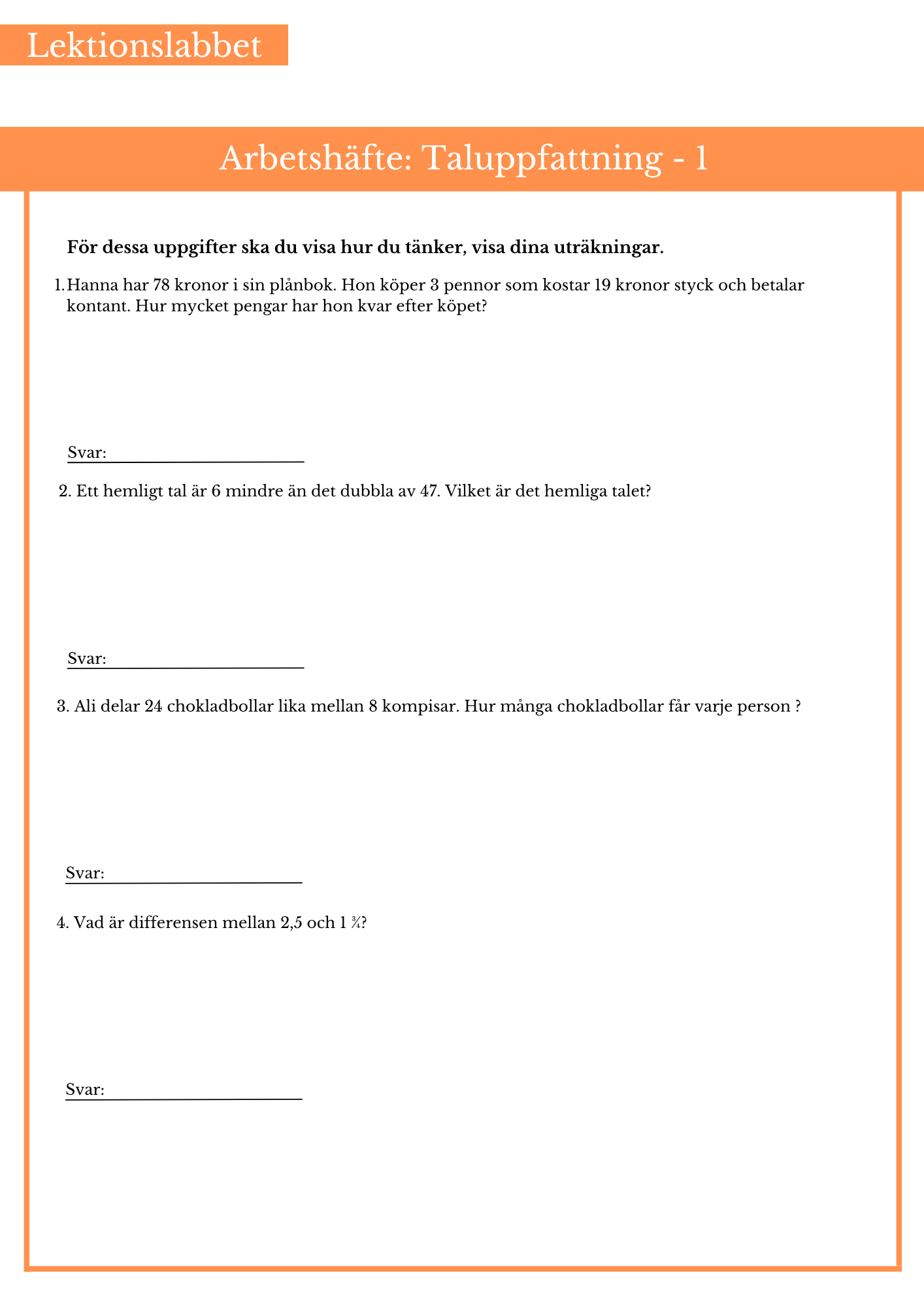 Öva på uppgifter inom taluppfattning. Passar bäst till årskurs 4 (sida 1,2), 5 och 6.