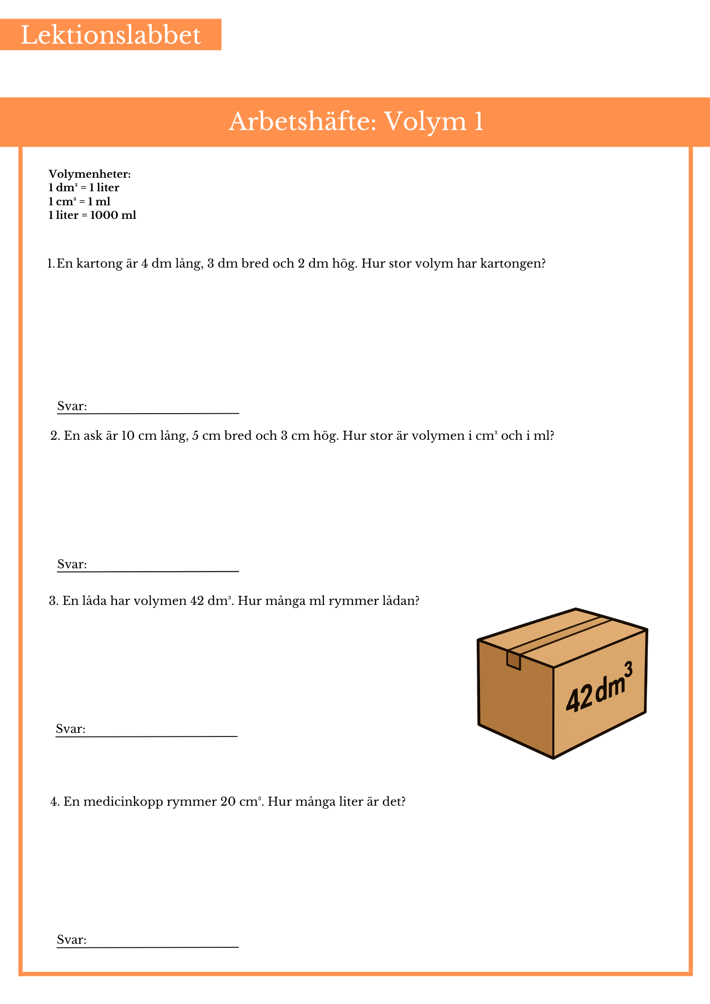 Öva på att räkna ut volym på rätblock samt enhetsomvandla med volymenheter. Passar bäst årskurs 6.
