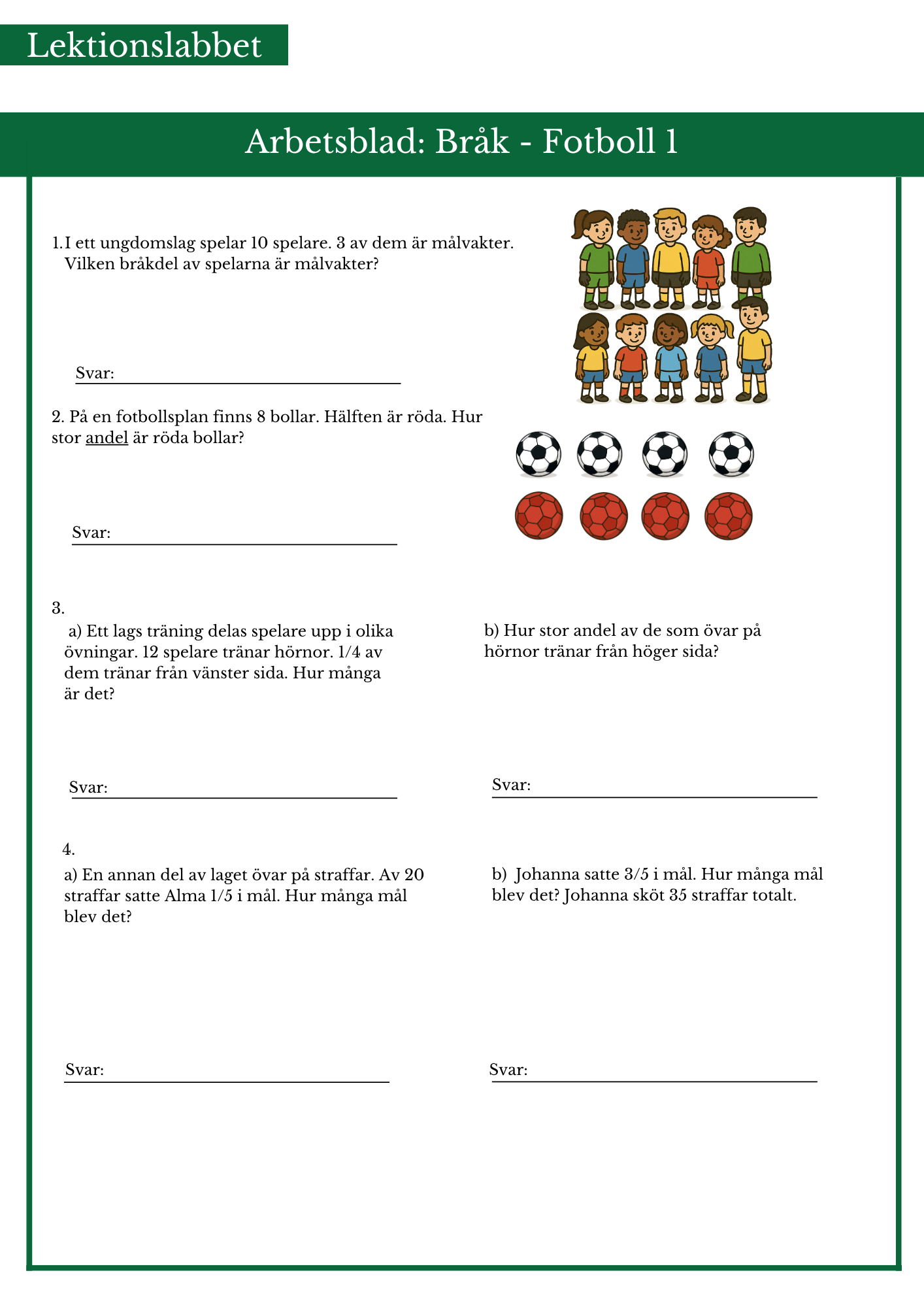 Räkna enbart bråk med fotbollstema. Passar bäst årskurs 4.