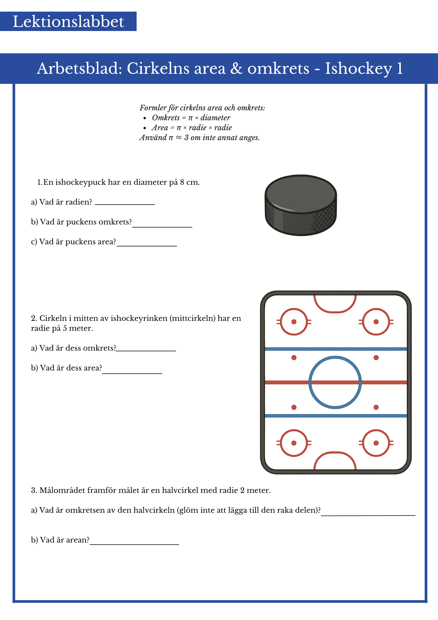 Räkna cirklars area och omkrets med ishockeytema. Passar bäst årskurs 5 och 6.