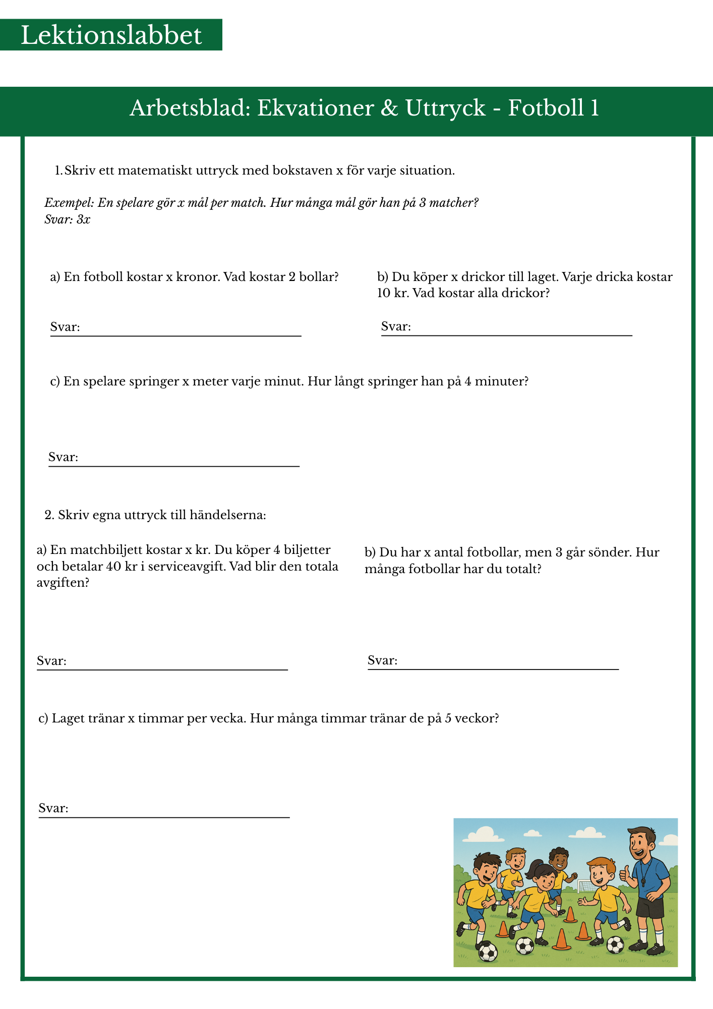 Ekvationer och uttryck med fotbollstema. Passar bäst årskurs 5 och 6.
