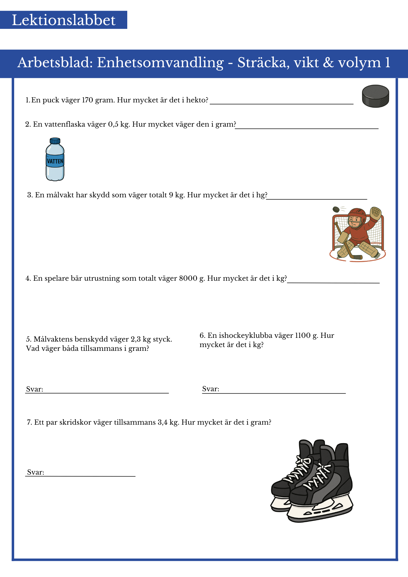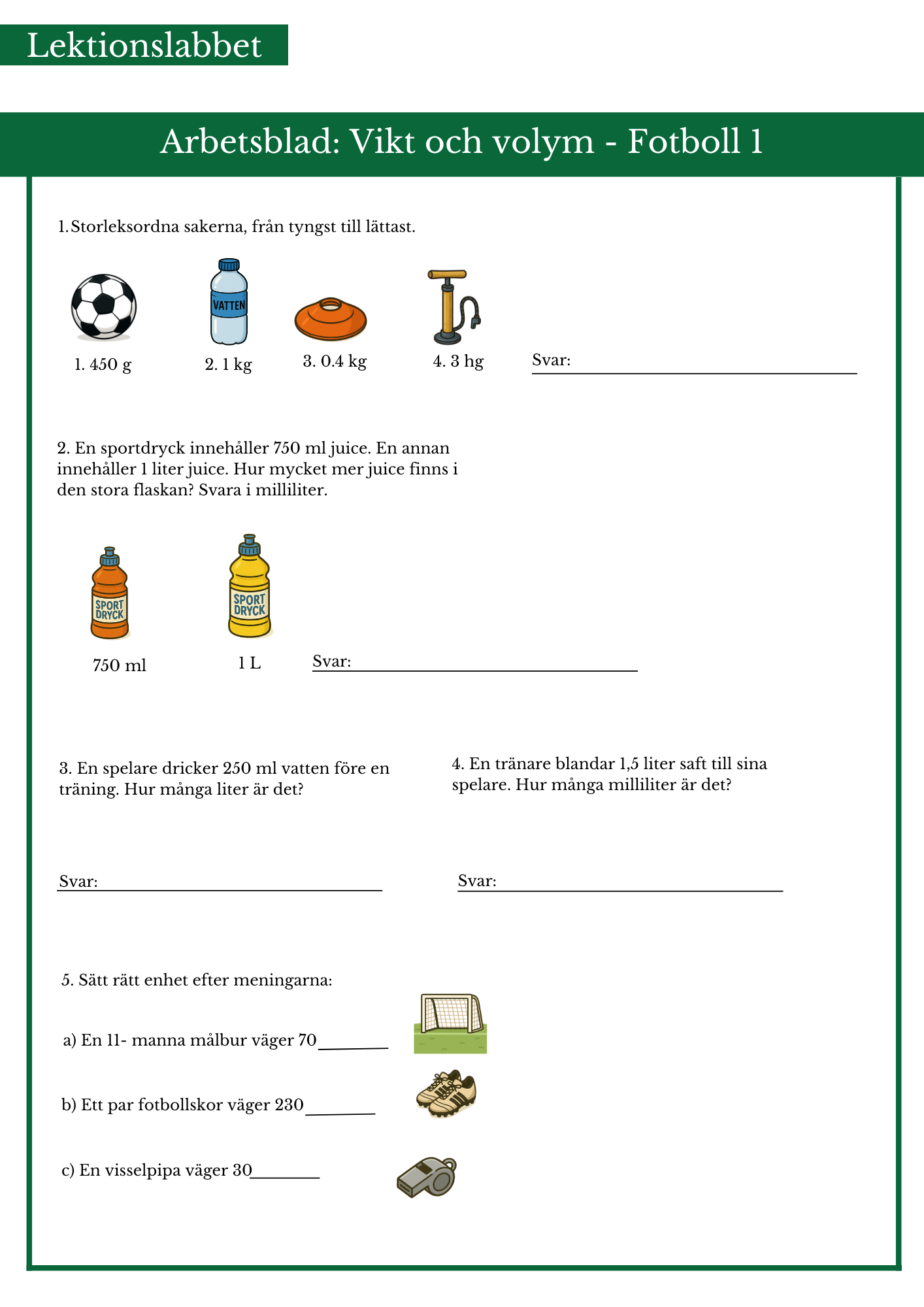 Träna på enhetsomvandla på vikt och volym med fotbollstema. Passar bäst årskurs 4 eller 5.