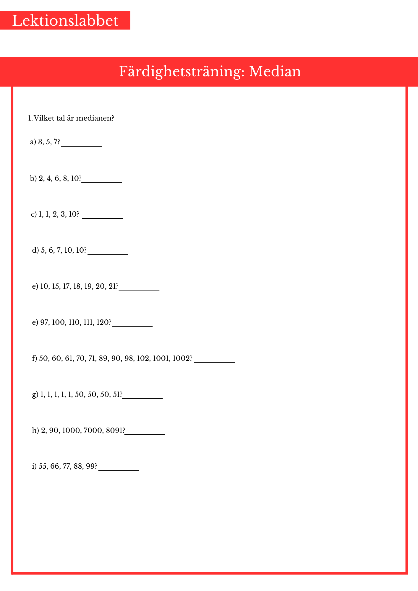 Räkna ut median. Passar bäst årskurs 4, 5 och 6.
