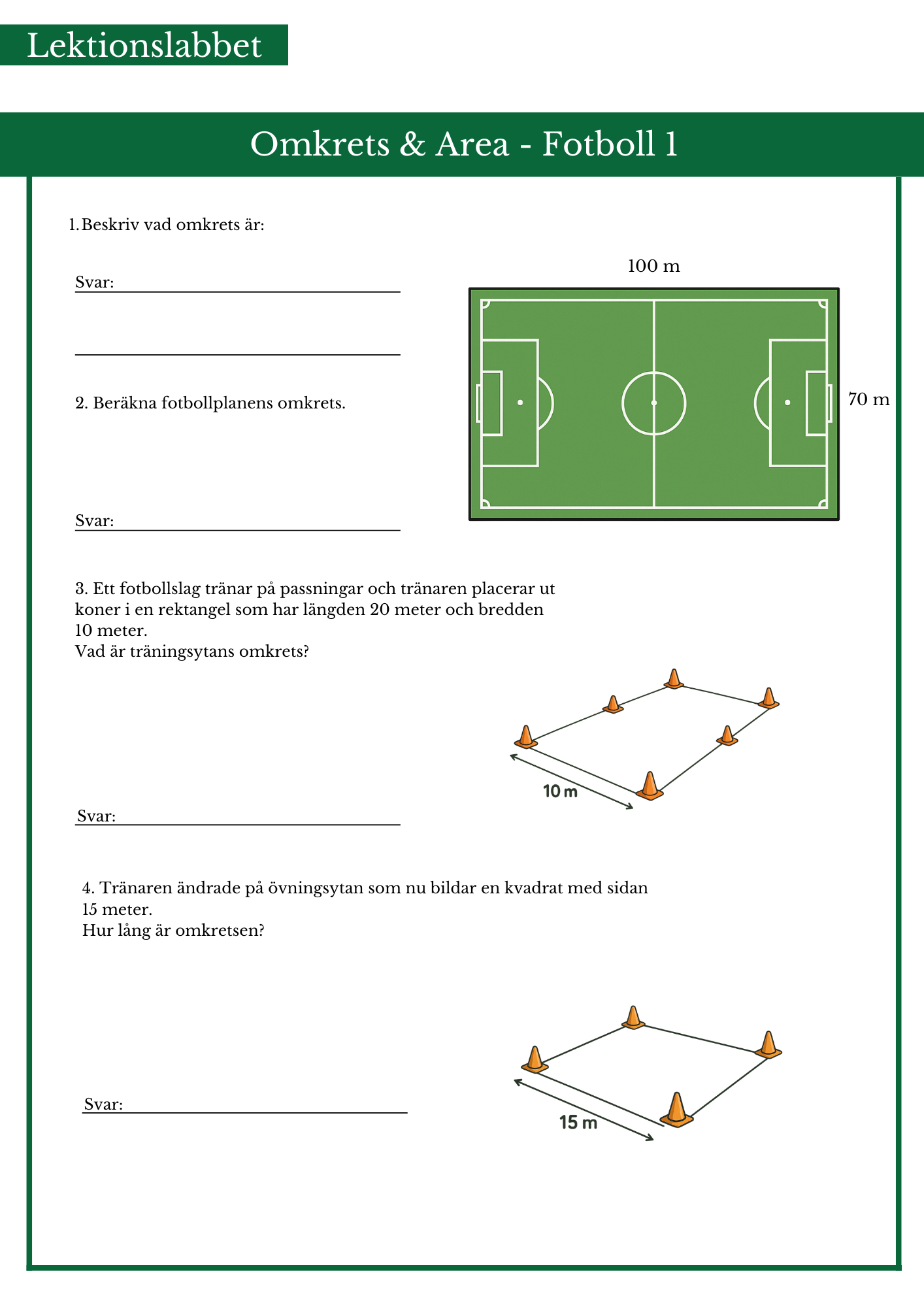 Träna på omkrets och area med fotbollstema. Endast kvadrater och rektanglar. Passar bäst årskurs 4 eller 5.