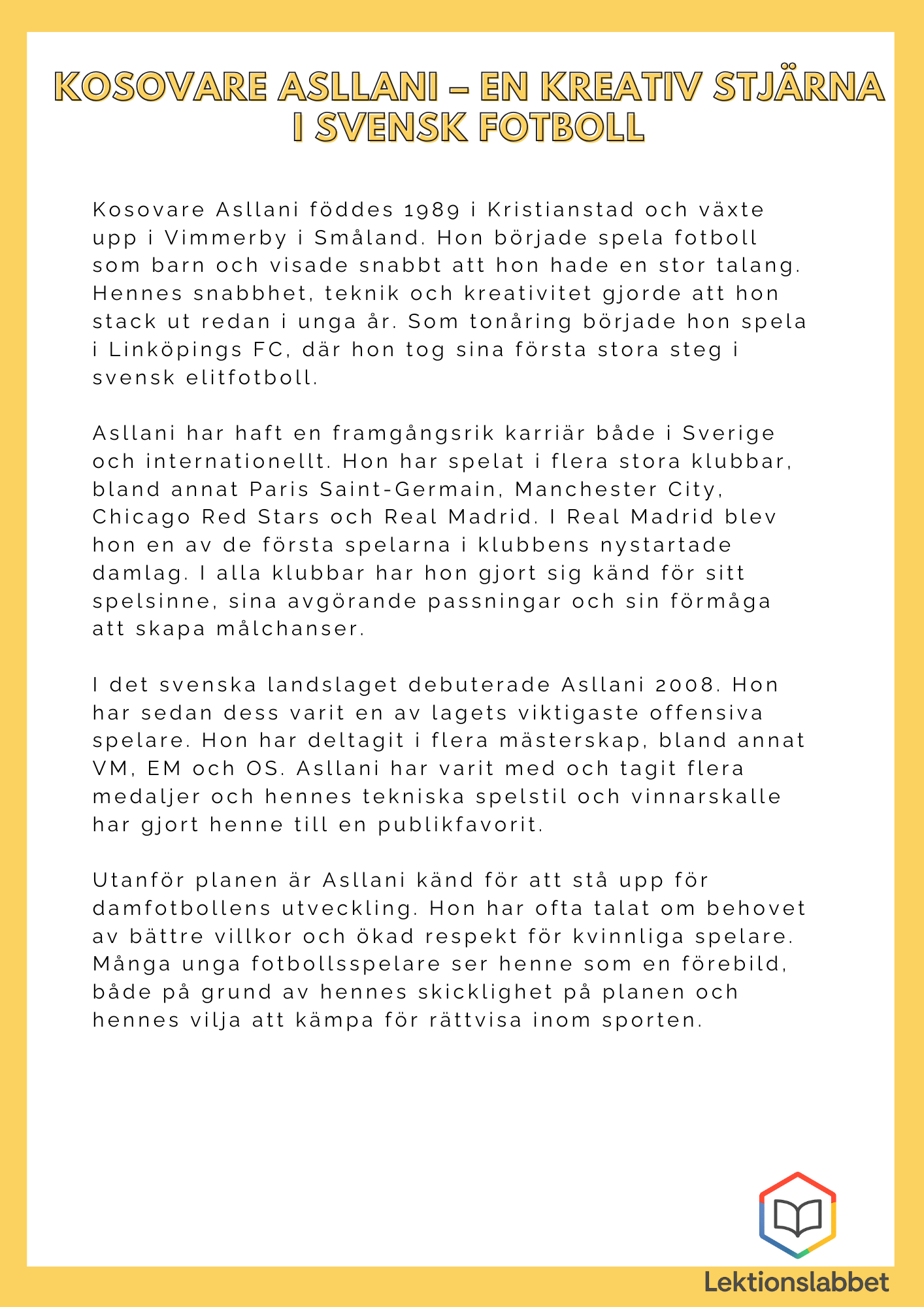 Läs och svara på frågor (i ett skrivhäfte) om Kosovare Asllani. Passar bäst åk 4.