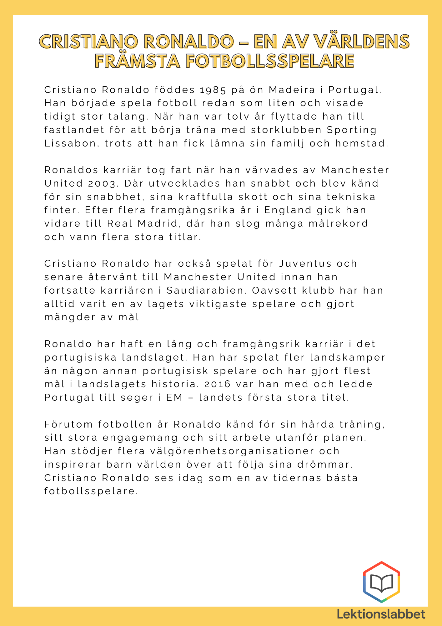 Läs och svara på frågor (i ett skrivhäfte) om Cristiano Ronaldo. Passar bäst åk 4.