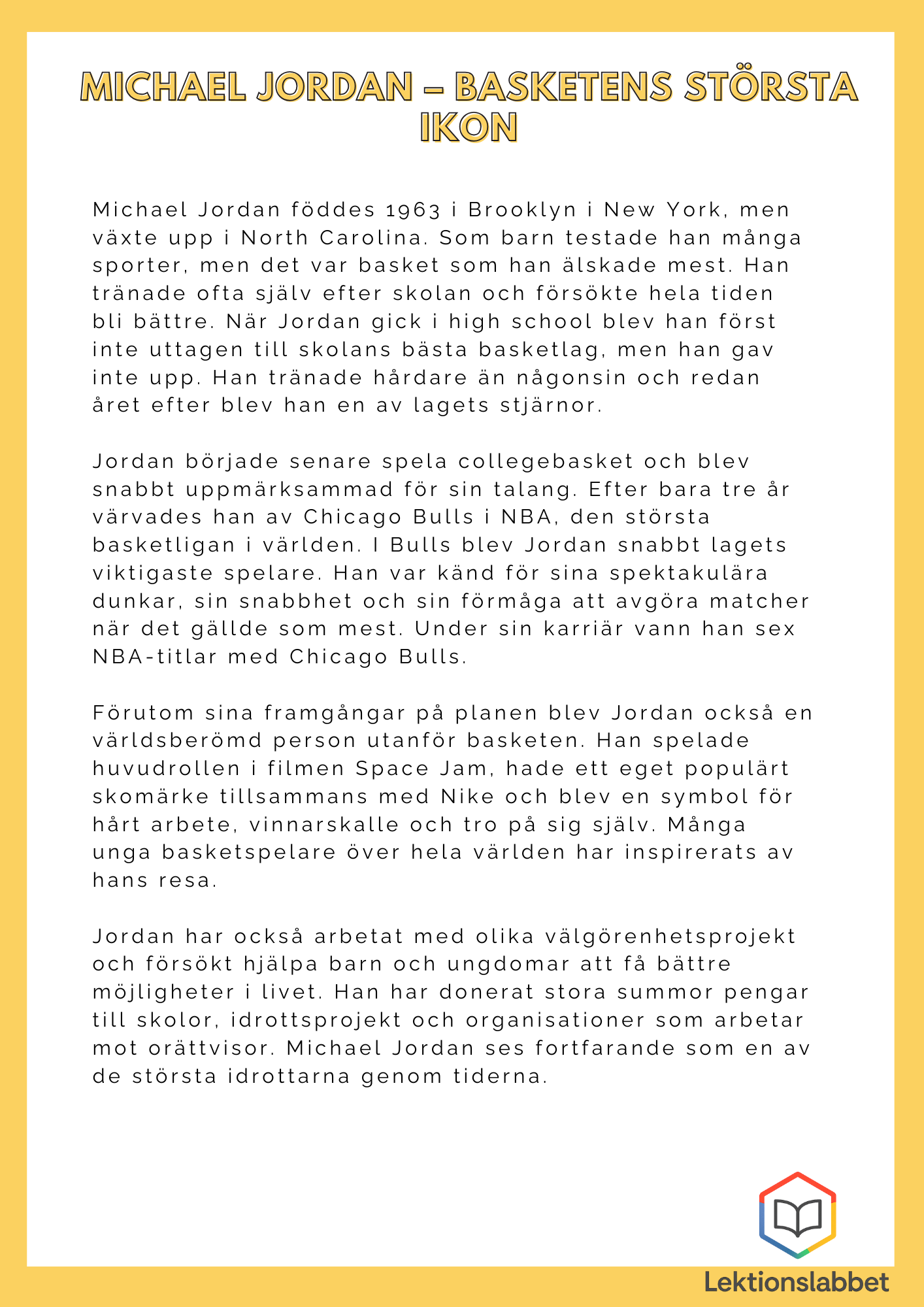Läs och svara på frågor (i ett skrivhäfte) om Michael Jordan. Passar bäst åk 4.