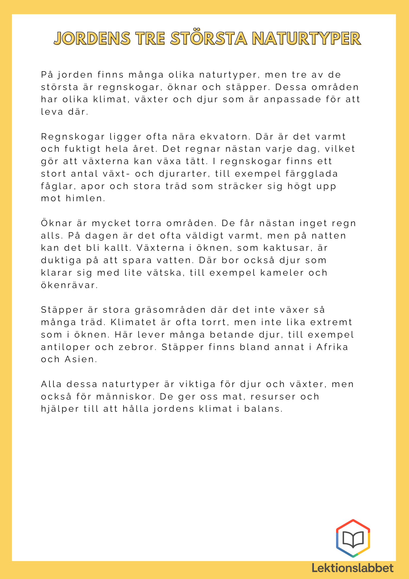 Läs och svara på frågor (i ett skrivhäfte) om jordens naturtyper. Passar bäst åk 4.