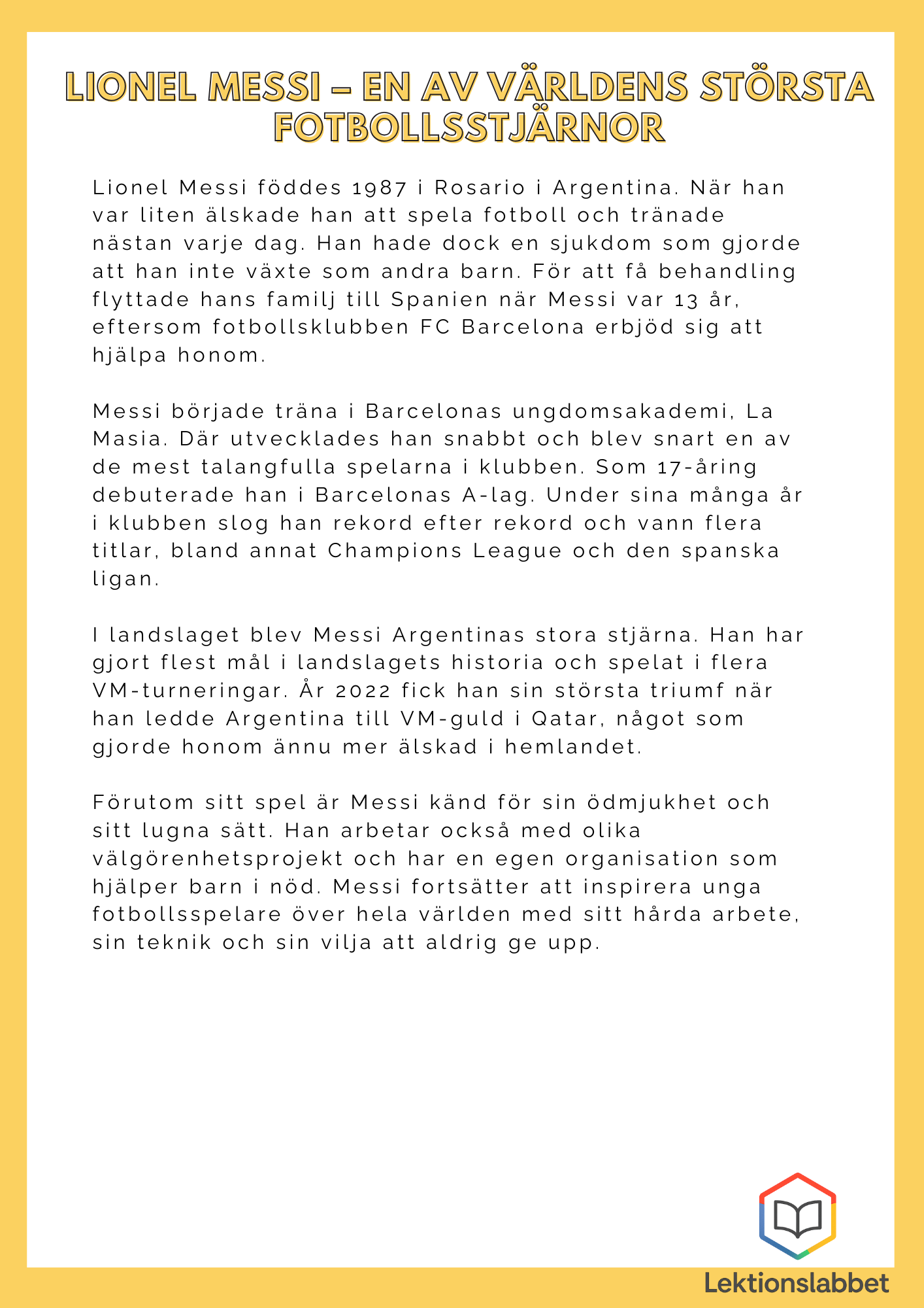 Läs och svara på frågor (i ett skrivhäfte) om Lionel Messi. Passar bäst åk 4.