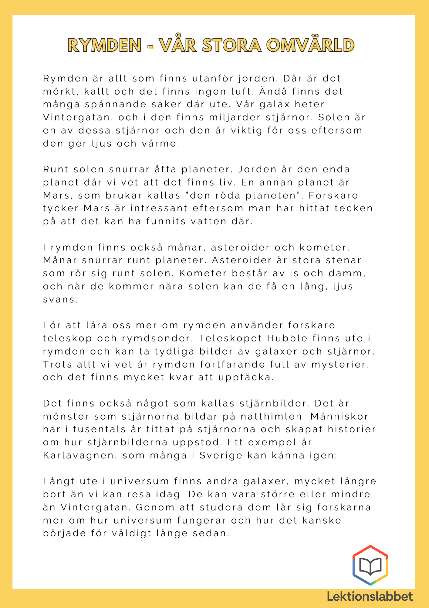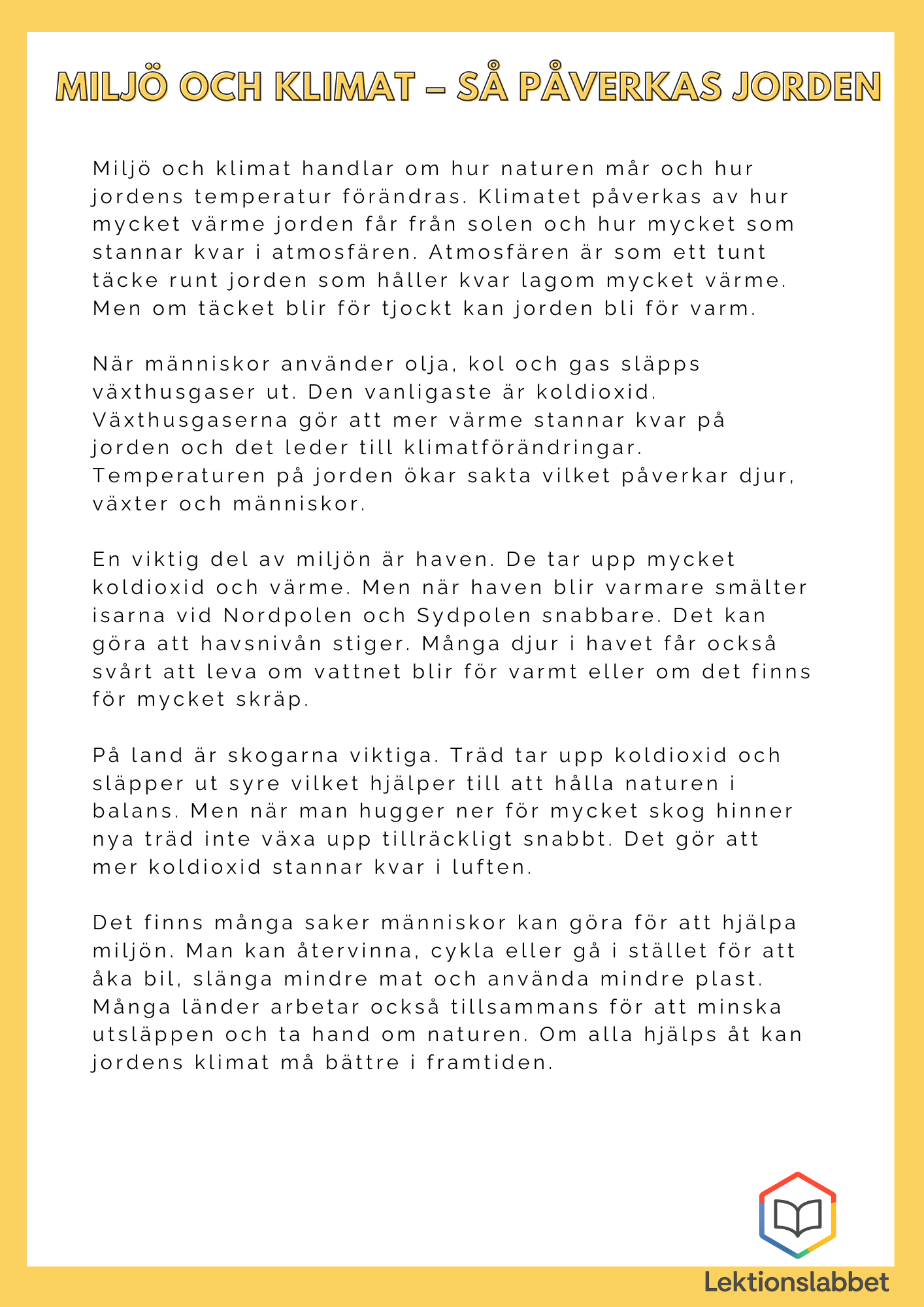 Läs och svara på frågor (i ett skrivhäfte) om miljö och klimat. Passar bäst åk 4.