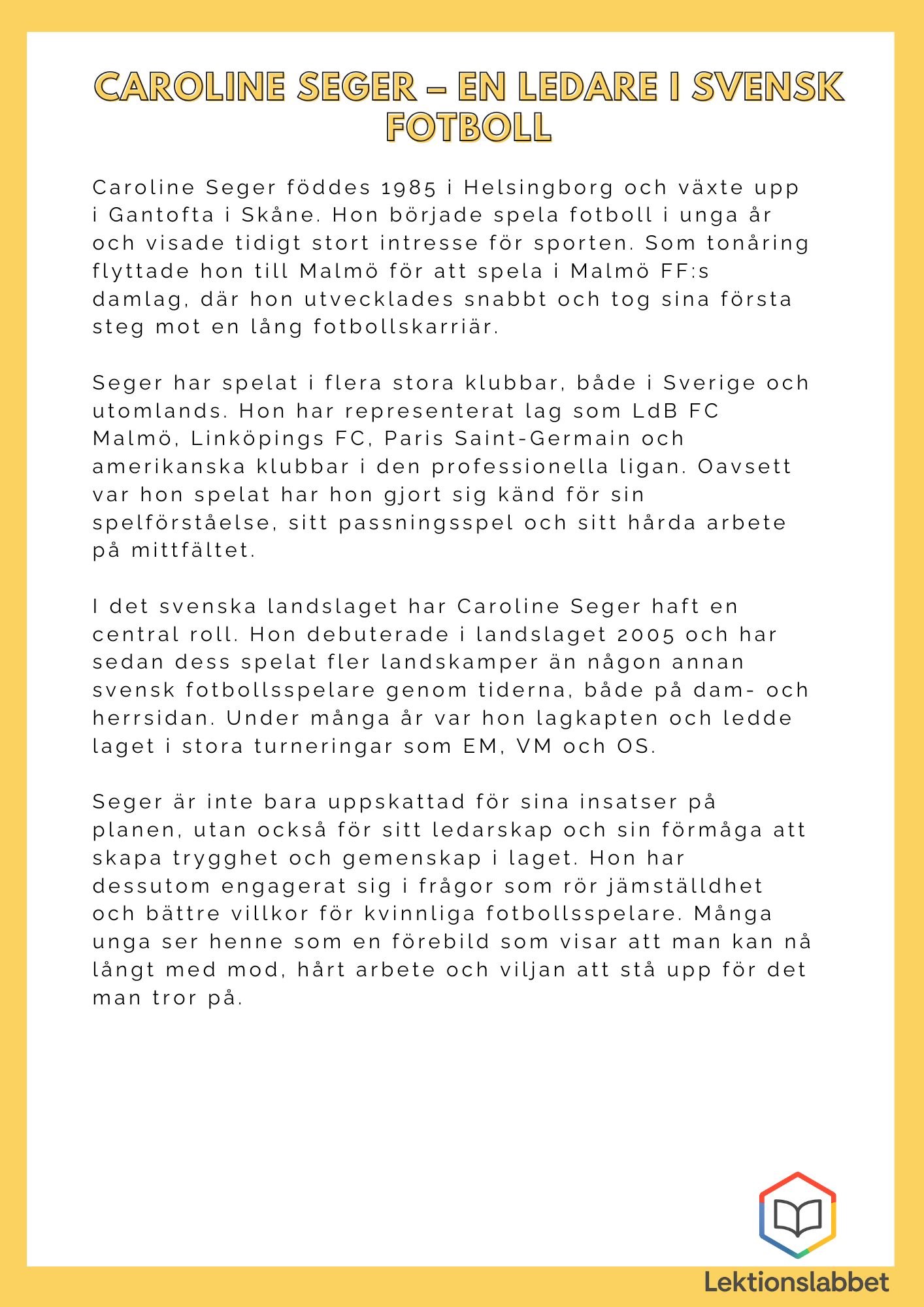 Läs och svara på frågor (i ett skrivhäfte) om Caroline Seger. Passar bäst åk 4.