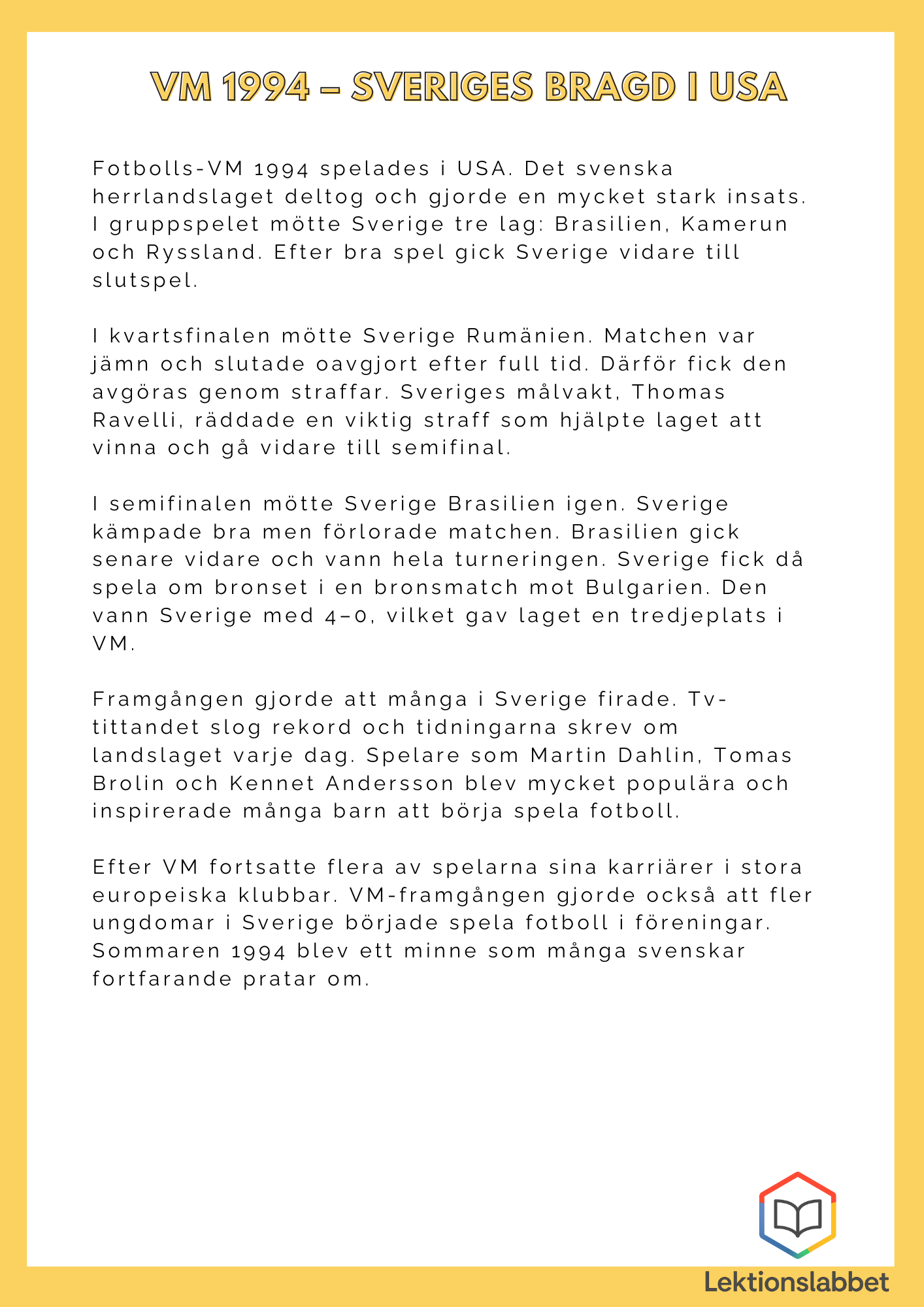 Läs och svara på frågor (i ett skrivhäfte) om VM 1994. Passar bäst åk 4.
