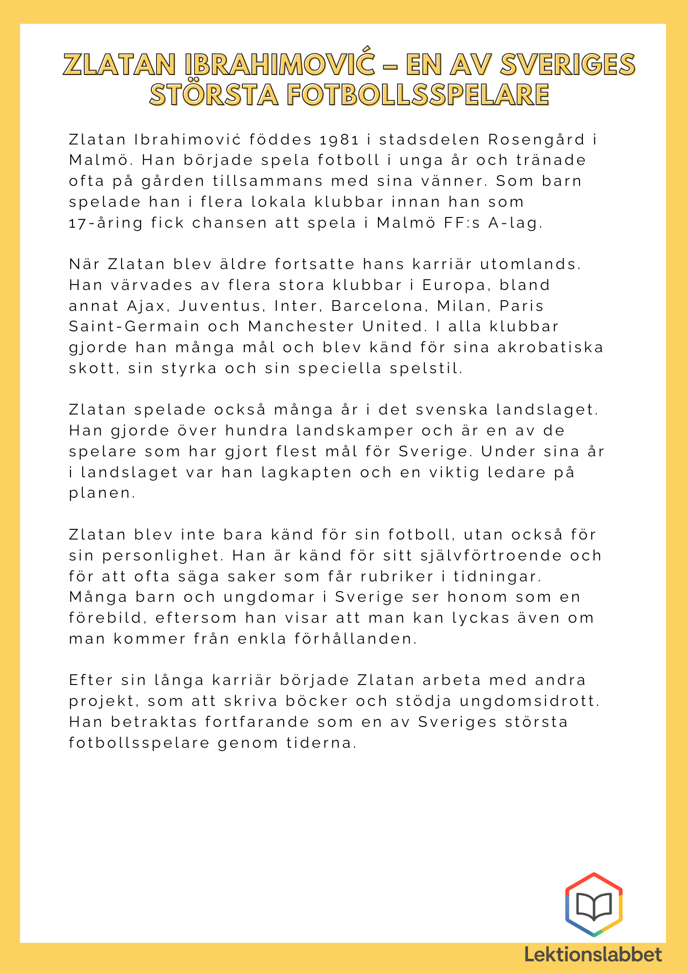 Läs och svara på frågor (i ett skrivhäfte) om Zlatan Ibrahimovic. Passar bäst åk 4.